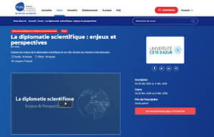 - Session 2 du MOOC "La diplomatie scientifique : enjeux et perspectives"La session (2026) du MOOC "La diplomatie scientifique : enjeux et perspectives" est ouverte.La formation - gratuite - se compose de 6 séquences (vidéos, textes et ressources) et de 3 interviews.Elle est estimée à 10 heures de travail et donne lieu, en cas de validation, à un badge.